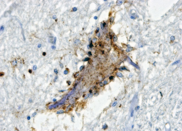 Motor neurons from a patient with ALS, where osteopontin is shown in gray. Blue indicates brain glial cells attacking the neuron.